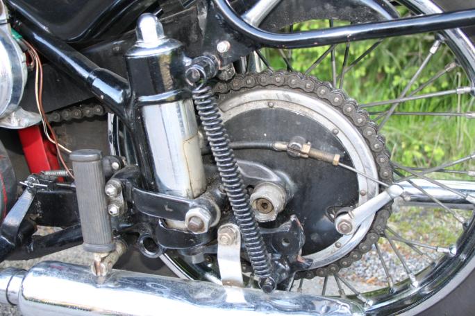 Plunger-fjæring. Bakhjulsfjæringen kom sent sammenlignet med ulike løsninger for framhjulet. Her var BMW tidlig på banen, og lanserte plungerfjæringen allerede i 1938. Tross i at Engelsk mc-industri var størst mht. produksjonsvolum, ble ikke bakfjæring vanlig før mange år etter 2.verdenskrig. Plungerfjæringen var forøvrig forløperen til svingarmen, og et viktig skritt i retning av full avdemping bak. Bakrammen var fortsatt statisk, men hjulet kunne nå bevege seg i vertikalretningen takket være en enkel demperinnretning, der baknavet var festet i den øvre delen av demperen. På 1950-tallet forlot de fleste mc-produsentene plungerfjæringen til fordel for svingarm med to støtdempere.