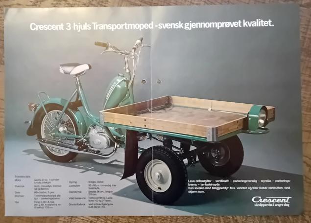 3-hjulsmopeder var i sin tid et rimelig og effektivt transportmiddel. De ble oftest brukt av firma i byer og tettsted, og egnet seg utmerket til å frakte varer i nærområdet. Typisk bruksområde var budkjøring over korte strekninger, som et alternativ til bil. Svensk-produserte Crescent var en av disse små, og markedsførte 3-hjulingen under slagordet "Crescent- så slipper du å angre deg". De slo samtidig et slag for det lave forbruket, og med kun 0.25 liter på mila skulle det ikke stå på drivstoffutgiftene.