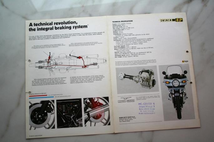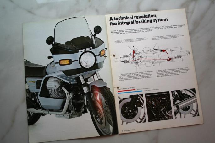 - The illustration in the brochure shows how the integrated braking system works. Moto Guzzi was the first motorcycle manufacturer to use this solution