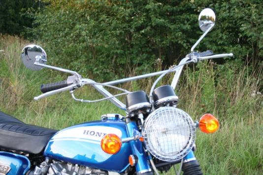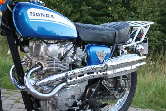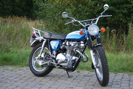 Nå er Jørgens horisont imidlertid vid, på tross av at garasjen er rimelig velfylt med flere eksemplar av H2, og innimellom de hysteriske 2-takterne stod det en litt sjelden motorsykkel, som på mange måter representerer et annet ytterpunkt, nemlig en Honda CL450. For der de blodtrimmede Kawasakiene legger igjen lange svarte striper i asfalten, var Hondaen tiltenkt fri ferdsel på grusveier langt ute på den amerikanske prærien. Vi snakker med andre ord om off-road. Om modellen ikke akkurat var tiltenkt som en 2-hjulet jordfreser for villmannskjøring over stokk og stein, var den i sin tid et tilbud i et segment som var i vekst, særlig i USA.