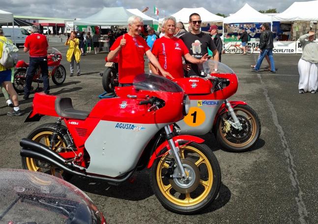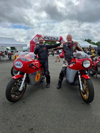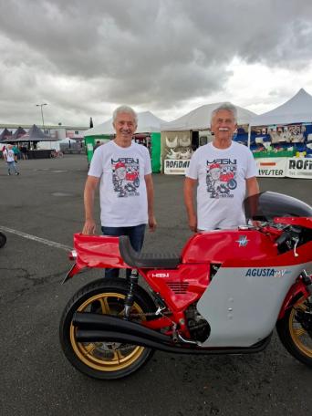 - Håkon Thorstensen (t.h.) på sin MV Agusta 750 S Magni i Frankrike i sommer. En fransk kompis kjører Magnien til venstre. Også den er eid av Håkon, men det er en annen histore. Foto: Privat