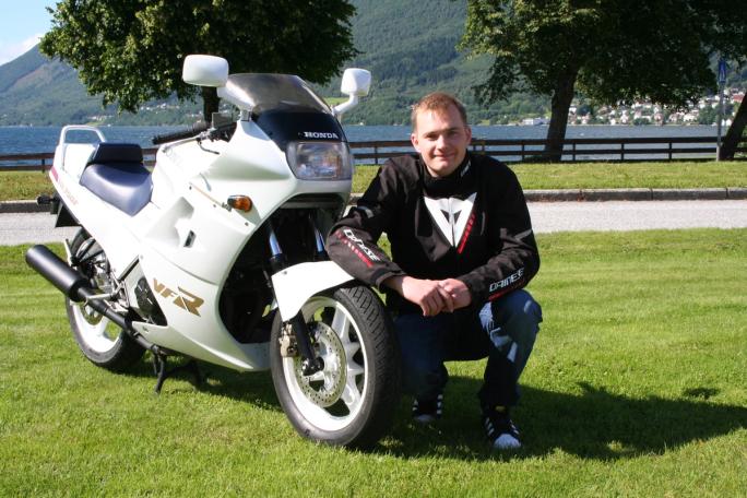 Mathias kom over sykkelen i 2021. Da var den godt brukt og trengte både deler og arbeid for å komme på hjulene igjen. Han har lagt ned både tid og penger i å få sykkelen i den stand den er i dag. Handlelisten besto bl.a. av sal, fothvilere, lykteglass, dekk, clutch, hendler, bremseklosser, og noe annet småplukk. I tillegg trengte kåpen nye dekaler, og ikke minst et lag med lakk. Mathias har gjort alt arbeidet selv, med unntak av lakkeringen. Resultatet er en strøken og flott VFR750 av første årgangen, 1986.