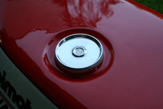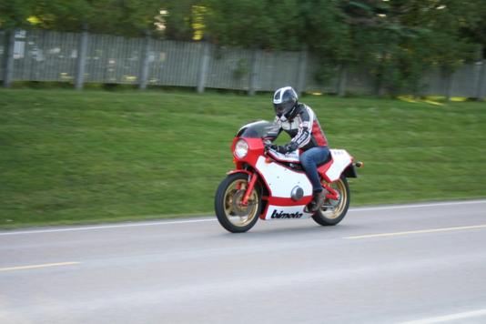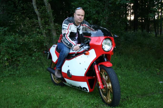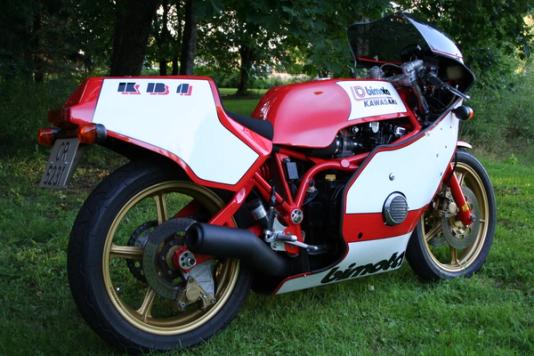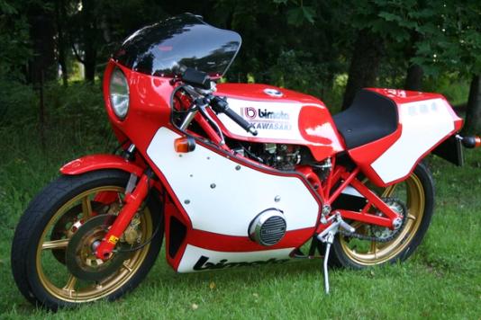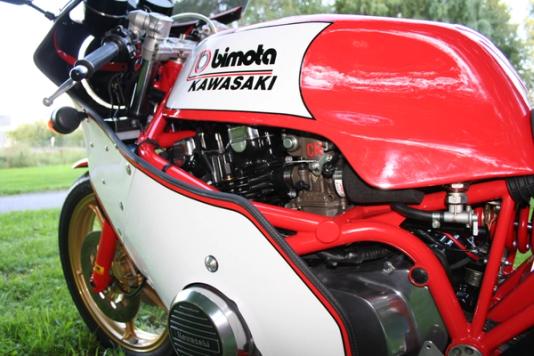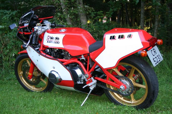 «Den grommeste sykkelen i samlingen er utvilsomt denne her» sier Tom Anders, og peker på den strøkne Bimotaen, en KB1, selvsagt med Kawasaki-motor. Tom Anders Rein fra Skedsmo vet og kan det meste om de klassiske Kawasakiene fra 1970-tallet. Han eier en rekke ulike modeller av det japanske merket som var først ut av lyskrysset, hvorpå jeg antar at Bimoaten må ha vært den raskeste av de alle. «Det stemmer» sier Tom Anders, og legger kjapt til at «den har motoren fra Kawasaki Z1000, så med 84 hk i det lette chassiset var den overlegen konkurrentene».
